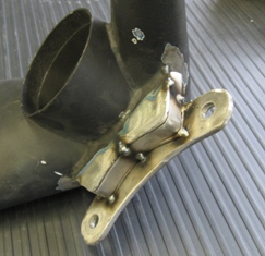 Adapting the rear was a lot more complicated. The Hawke upright brake mounts were trimmed back and reinforced with some 1/2"x1/8" flat stock bent into shape. The adapter bracket was then added. |