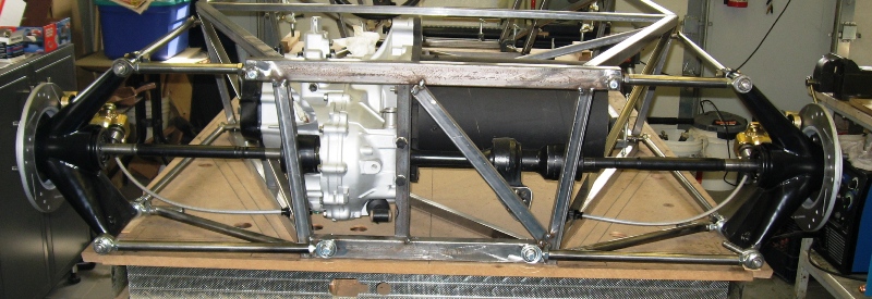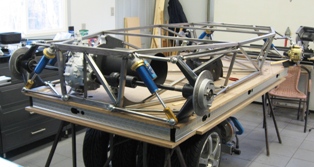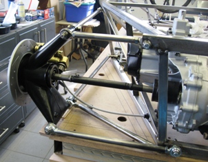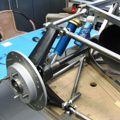 A-arms are complete and shocks mounted. I tried to copy the Lotus 23 geometry as much as possible. This was challenging to say the least since none of the pivot points are parallel to the centre lines of the chassis. |