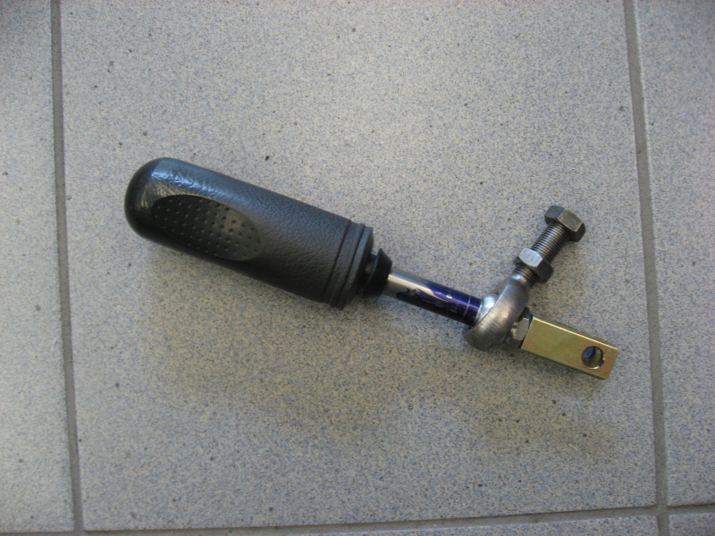 I reworked the original Swift shift lever to shorten the throw to about 2 inches. The rod end allows for adjustment and the clevis at the bottom connects to the linkage that runs to the transmission. |