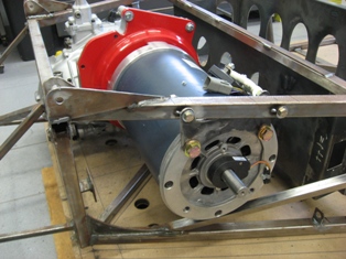 Sept 4, 2010 - Motor and transmission installed in order to fabricate the last motor mount. Unbelievably, the clearance between the motor and the chassis is 1/8" - exactly as calculated. |