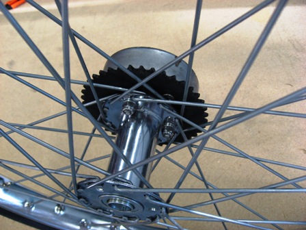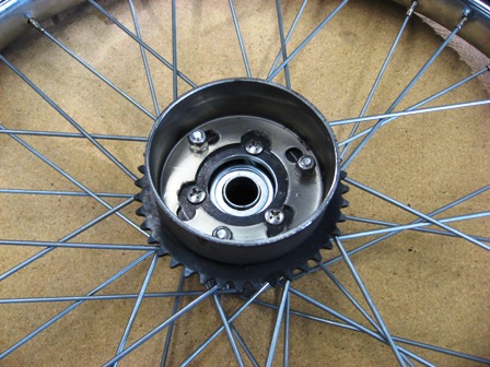 Drive sprocket and brake drum mounted on wheel.